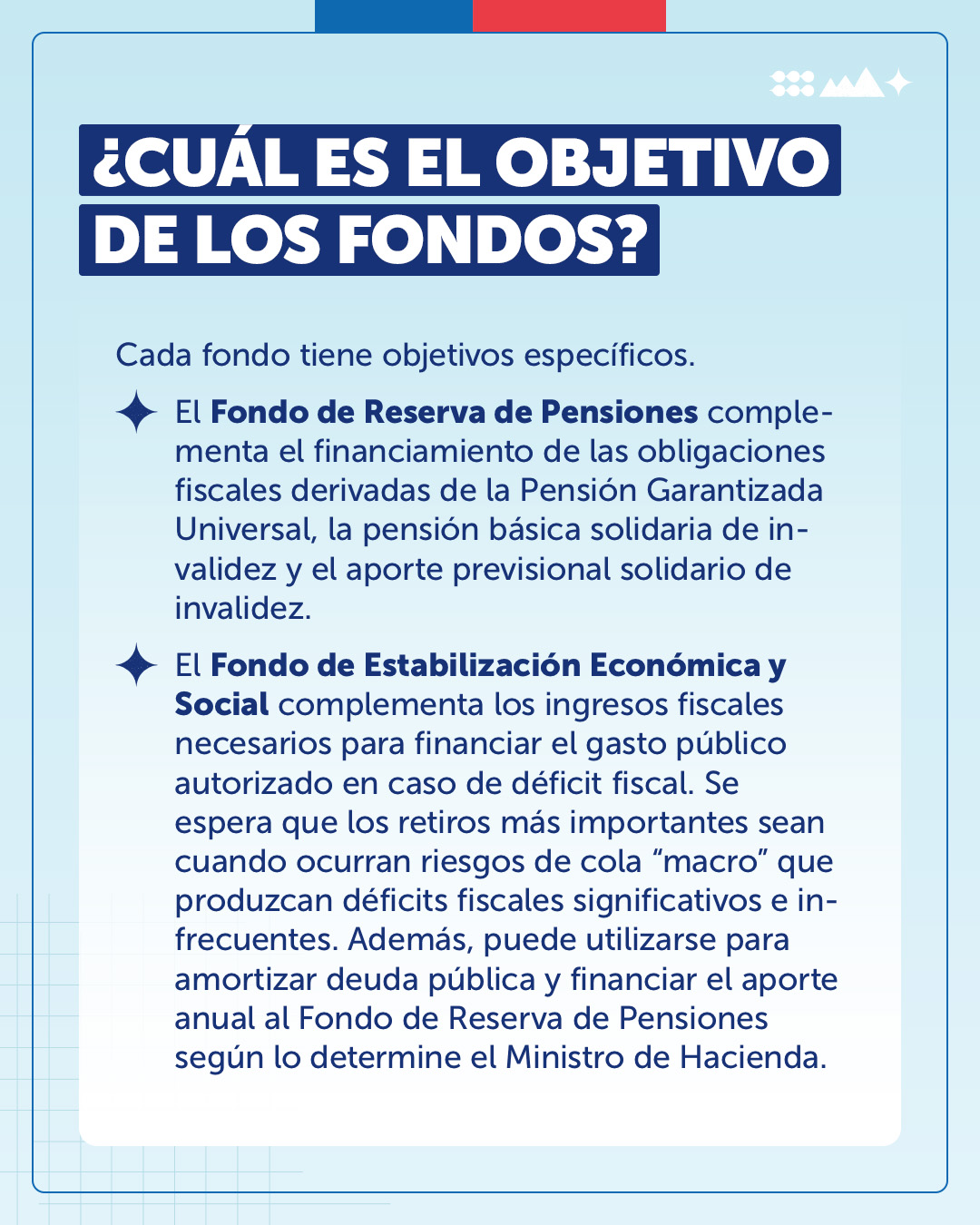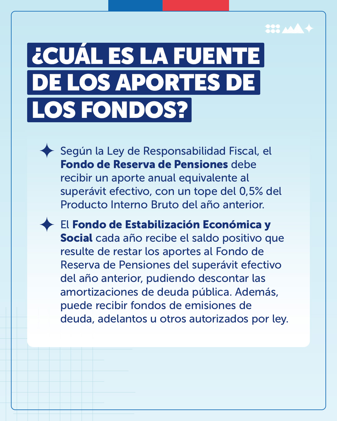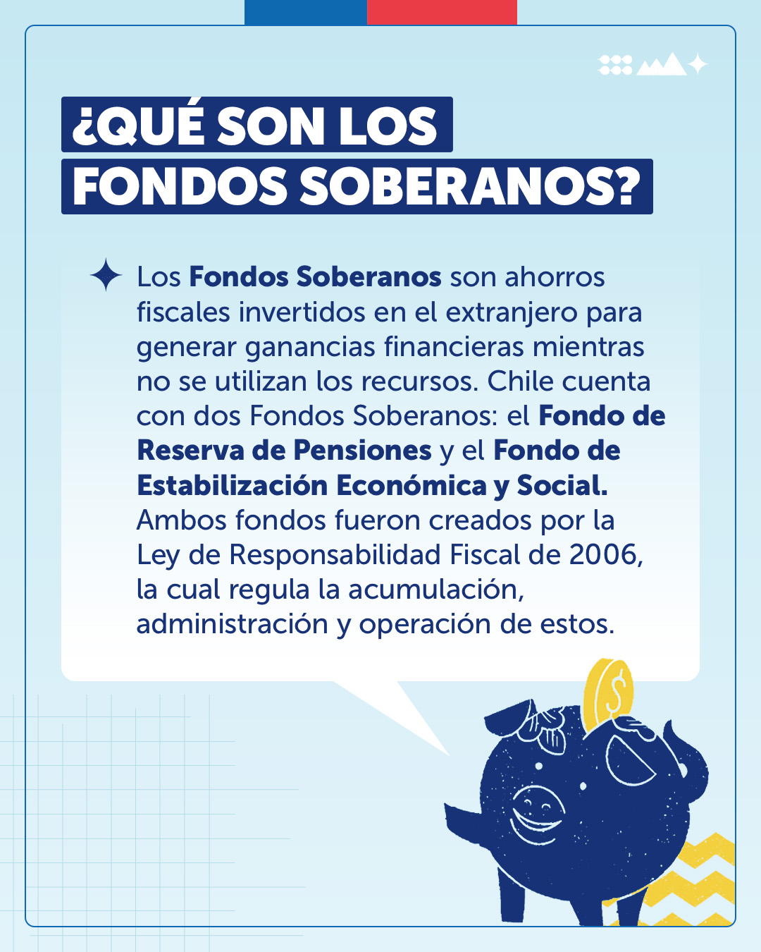 Los Fondos Soberanos forman parte fundamental de la política fiscal implementada por el Gobierno de Chile. Su objetivo es contribuir a la estabilidad macroeconómica y a financiar ciertos pasivos contingentes. Es así como el Fondo de Reserva de Pensiones (FRP), creado a fines de 2006, fue establecido para financiar las obligaciones previsionales del Fisco hacia los sectores más desposeídos. Por su parte, el Fondo de Estabilización Económica y Social (FEES), creado a principios de 2007, tiene por finalidad financiar déficit fiscales y la amortización de deuda pública.