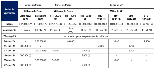 Las operaciones se realizarán a partir del 4 de junio, y durante todo ese mes. En ellas, se ofrecerán Letras en pesos con vencimiento en mayo de 2027, Letras en Pesos con vencimiento en abril de 2029 y la reapertura del bono en UF con vencimiento en octubre de 2028.
