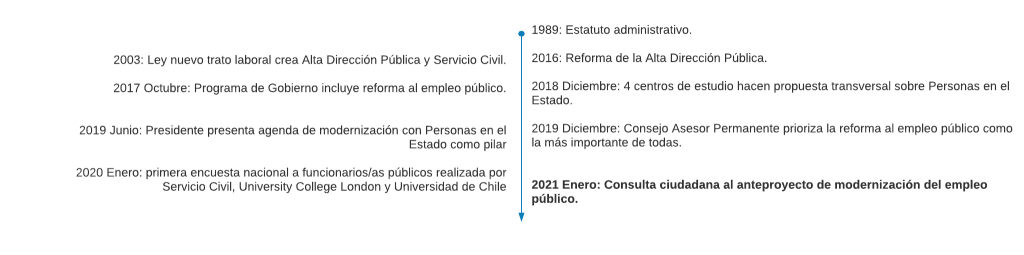 Asimismo, se sustenta en el aporte realizado por cuatro centros de estudio – Centro de Estudios Públicos (CEP), Chile 21, Espacio Público y Libertad y Desarrollo-, que en enero de 2019 presentaron el informe “Gestión de Personas en el Estado”, con propuestas concretas para modernizar el empleo público, y en las recomendaciones del Consejo Asesor Permanente para la Modernización del Estado, que en diciembre de 2019 priorizó la reforma al empleo público como la más relevante de la agenda de modernización. En ellos se constata una “crisis del empleo público” y una necesidad de actualizar las reglas del juego, dado que el Estatuto Administrativo data de 1989 y la última reforma relevante al empleo público fue el año 2003 posterior a la crisis de institucionalidad generada por el caso MOP–GATE.