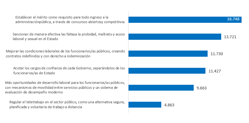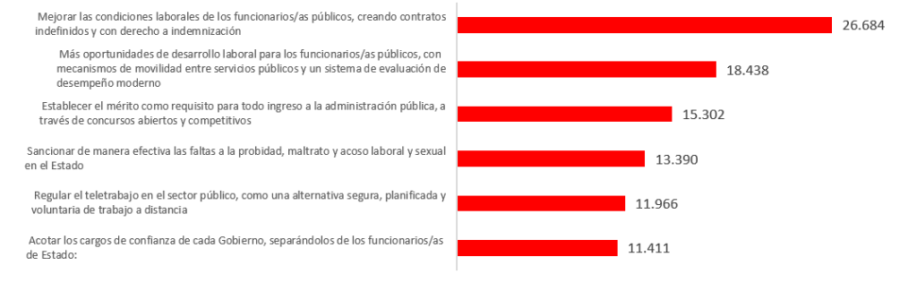 De estos ejes, los más prioritario para los consultados fueron la creación de contratos indefinidos y con derecho a indemnización y el establecimiento del mérito como requisito de entrada al Estado.
