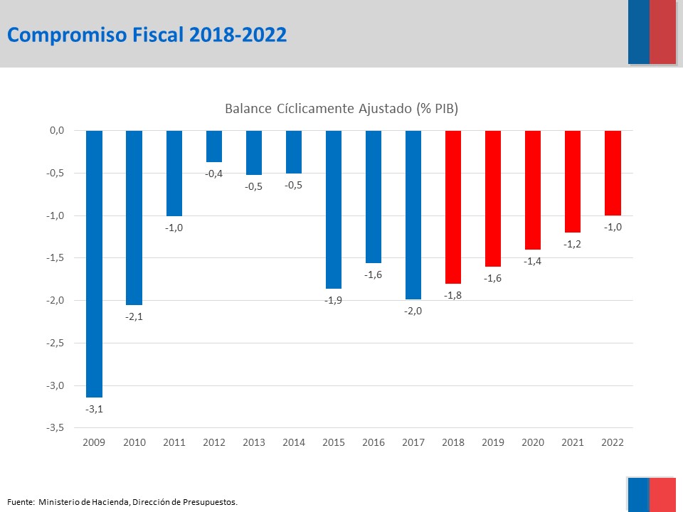 Junto al Director de Presupuestos, Rodrigo Cerda, el ministro Larraín explicó que la meta fiscal consistirá en la reducción anual de 0,2 puntos del PIB del déficit estructural, actualmente ubicado en 2% del PIB. Es decir, hacia el año 2022 —el último cuyo presupuesto será establecido por esta administración—, el déficit fiscal estructural se ubicará en 1% del PIB.