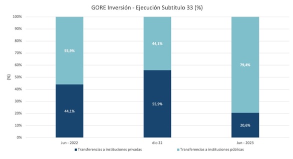 La directora de Presupuestos destacó que “también se fortaleció la capacidad ejecutora de los Gobiernos Regionales y se fomentó la ejecución con instituciones públicas por sobre privadas. Esto último ha mostrado resultados: en el primer semestre de 2022 el 44,1% de las transferencias de Gobiernos Regionales fueron a instituciones privadas, y al mismo período de este año, estos traspasos se redujeron a menos de un 20% del total”.