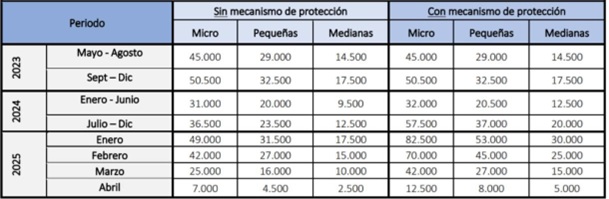 El subsidio estará vigente hasta abril de 2025. Con todos estos ajustes, el subsidio ahora irá en beneficio de cerca de 180 mil MiPymes y Cooperativas. Esto representa un esfuerzo del Estado superior a los $320.000 millones, que en caso de activarse el mecanismo de protección estaría cercano a los $400.000 millones.